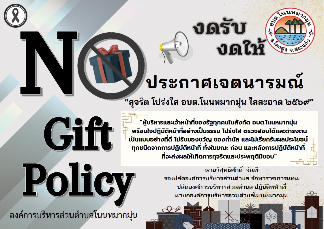 Home/No Gift Policy ประกาศเจตนารมณ์ "สุจริต โปร่งใส อบต.โนนหมากมุ่น ใสสะอาด 2569" No Gift Policy จากการปฏิบัติหน้าที่ (ภาษาไทย และ อังกฤษ)/No Gift Policy ปี 2569 ฉบับภาษาไทย No Gift Policy ปี 2569 ฉบับภาษาไทย